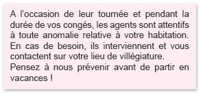 - Gérer les opérations de tranquillité vacances (O.T.V.), avec rondes durant l’absence des propriétaires. Toutes les habitations à surveiller pendant que leurs occupants sont en vacances sont listées par la police municipale