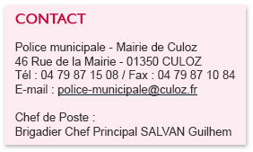 La police municipale de Culoz est composée de deux policiers, Brigadiers Chefs Principaux, placés sous l'autorité directe du Maire.
